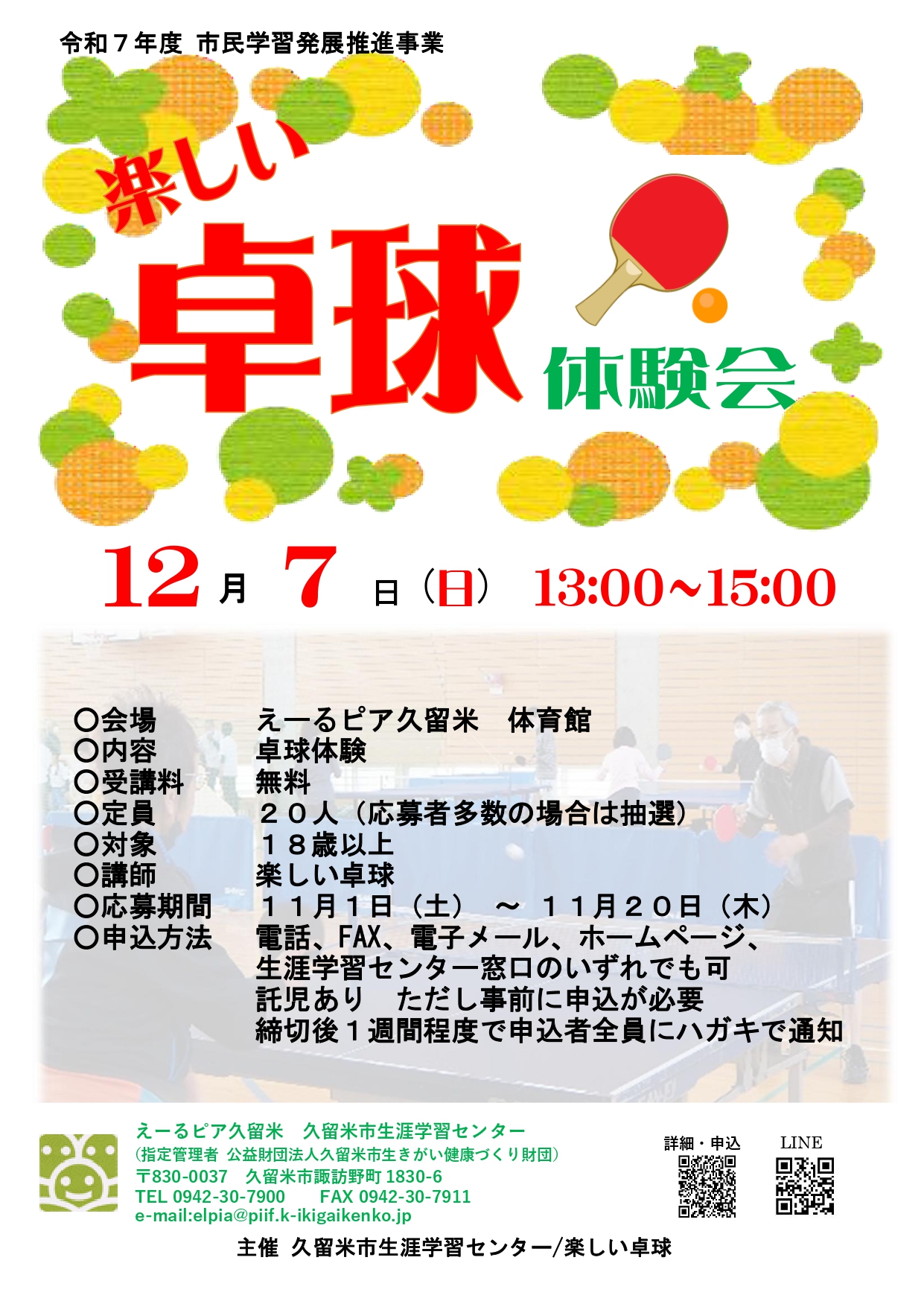 卓球は安全性が高く、健康の維持増進にはとても良いスポーツです。 卓球を始めてみたい方、久しぶりにやってみようという方、 卓球サークル「楽しい卓球」で一緒に活動してみませんか。