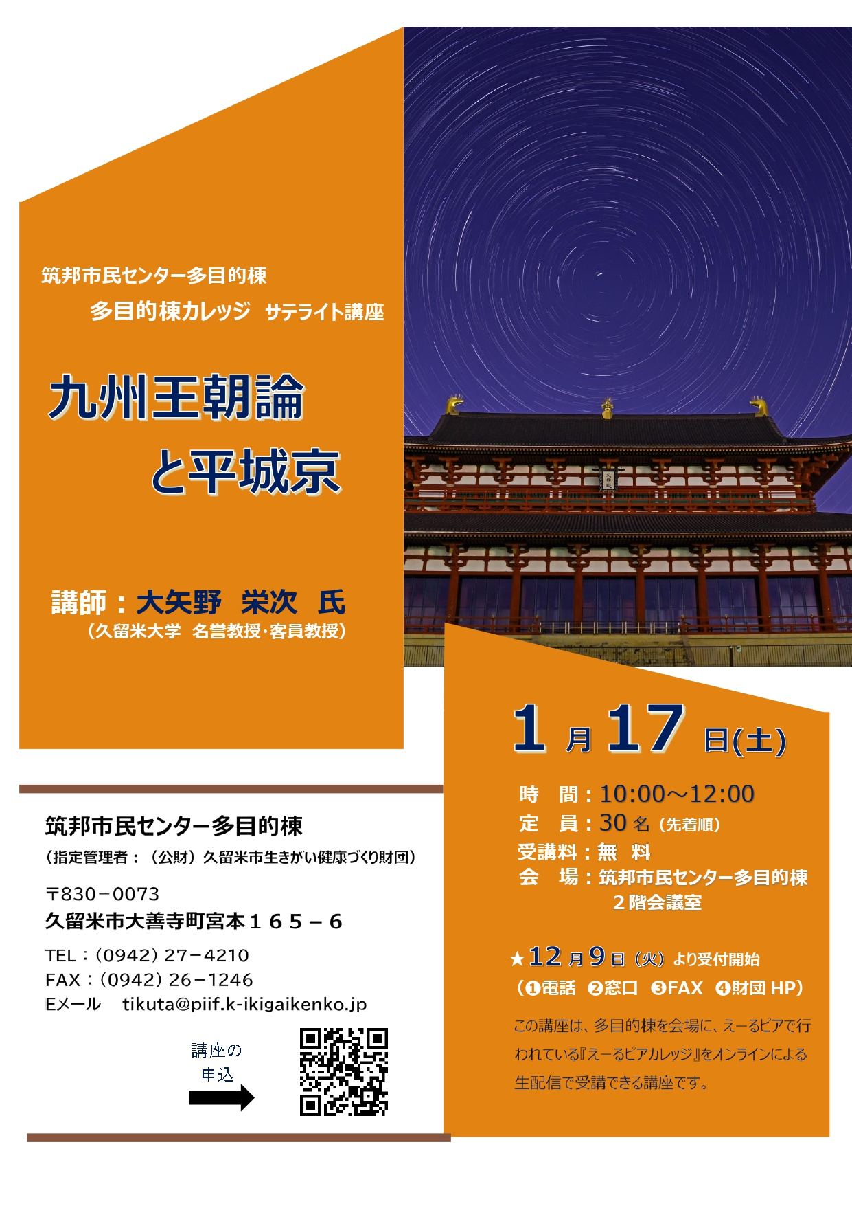 多目的棟カレッジは「時事問題」 「産業」 「歴史」等、身近で現代的・社会的な課題に関する学習講座です。 サテライト講座は、多目的棟を会場に、えーるピアで行われている「えーるピアカレッジ」をオンラインによる生配信で受講できる講座です。 たくさんのご応募、お待ちしております。