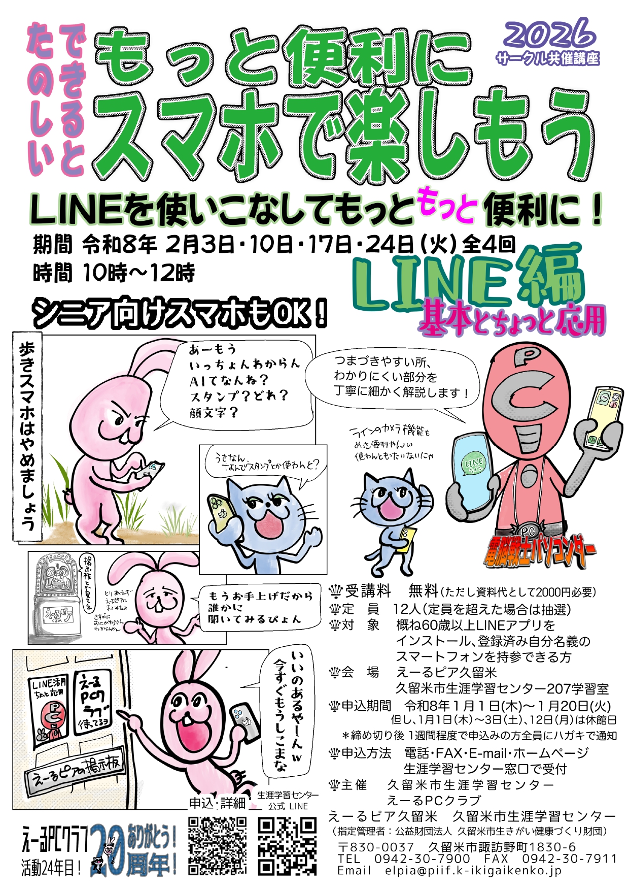 LINEアプリの基本と応用を学びます。 講師は「えーるPCクラブ」の皆さんです。