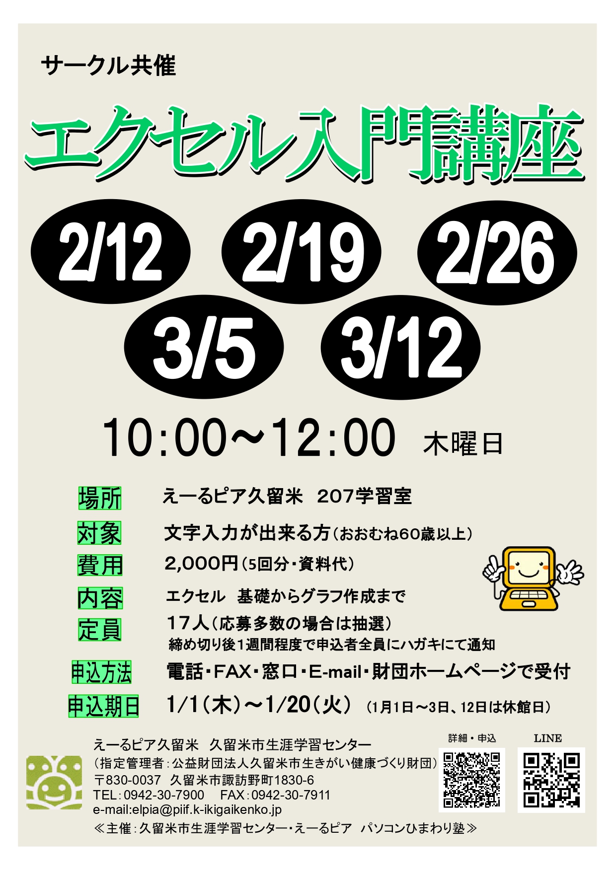 えーるピア久留米で活動しているサークル『えーるピアPCひまわり塾』が講師です。 エクセルの基礎からグラフ作成までを行います。