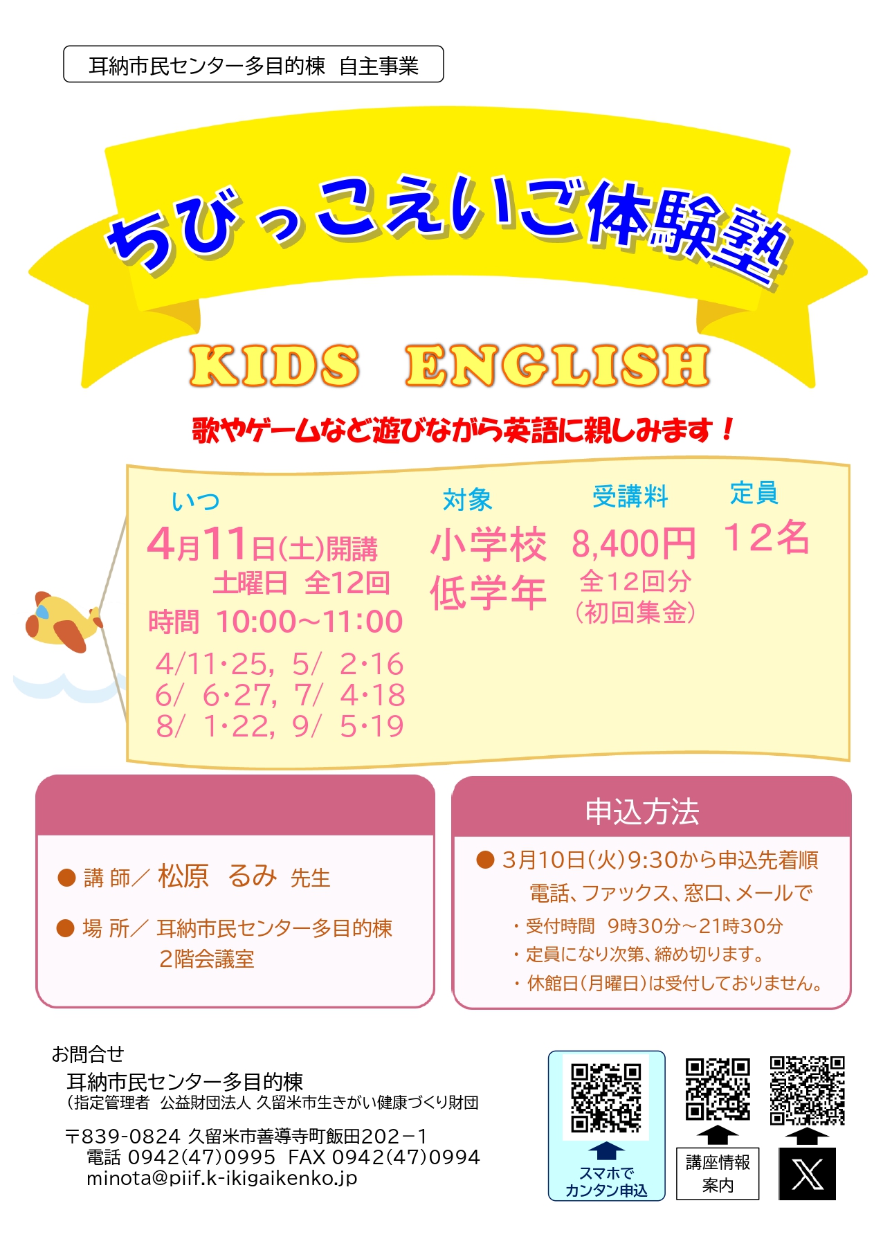 耳納市民センター多目的棟 〒839-0824 久留米市善導寺町飯田202番地1 電話番号:0942-47-0995 FAX:0942-47-0994 メール:minota@piif.k-ikigaikenko.jp |